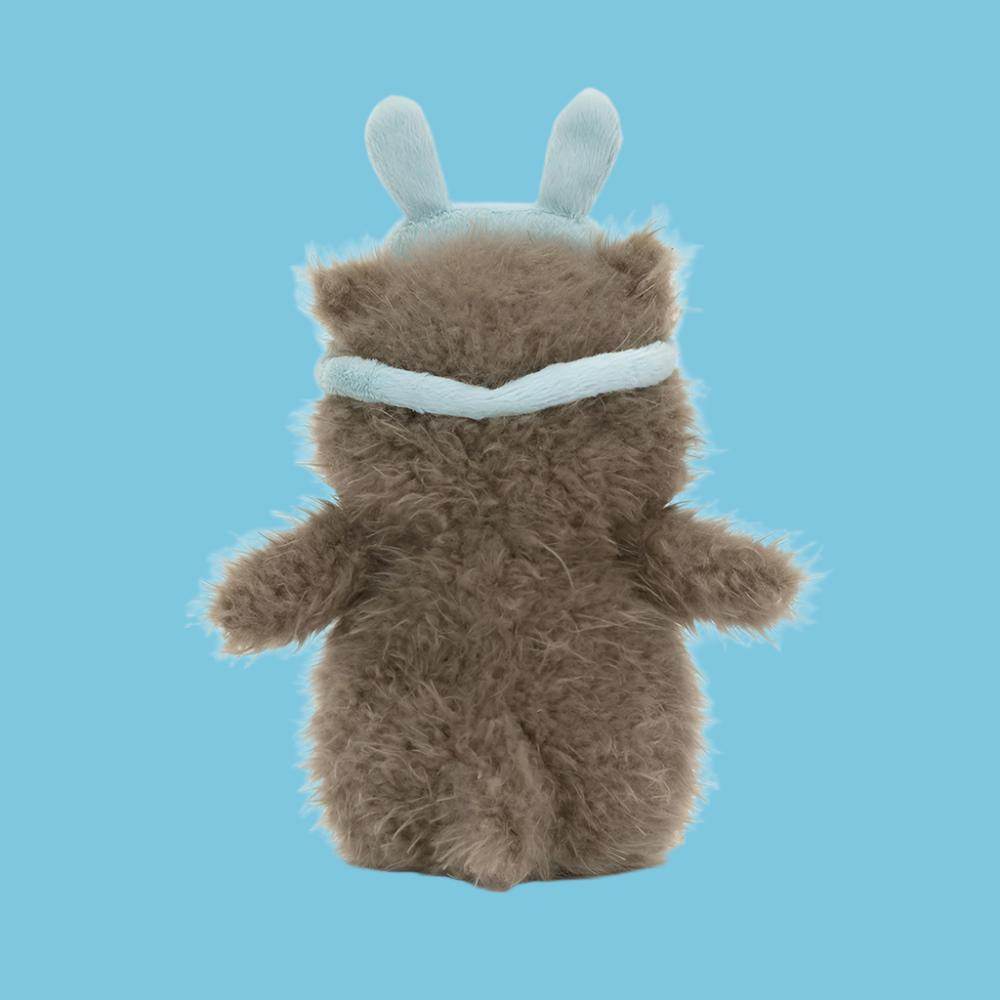Meet Audrey Hootsoftly, the sleepyhead who adores lounging in! Sporting her adorable blue suedette mask with embroidered lashes, this mocha owl is all about cozy naps. With her charming bed-head fur and wide-awake bobble eyes, Audrey is simply irresistible. Her sunny feet, tiny wings, and an oatmeal patch on her tummy make her an absolute hoot and the perfect companion for lazy days!