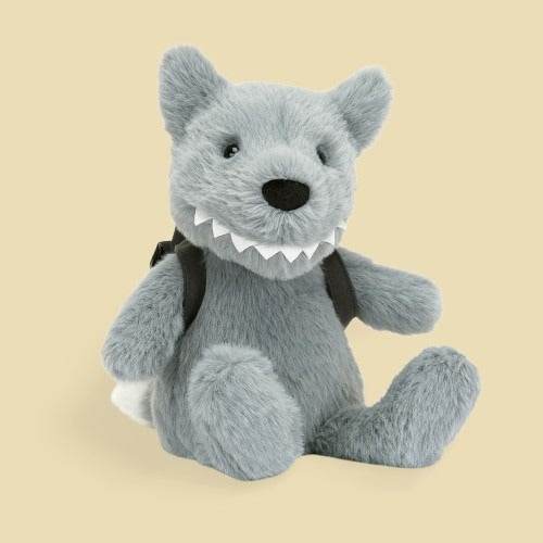 Backpack Wolf is ready for adventure, trotting off into the wild with a matching mini backpack in tow! With soft bluey-grey fur, squishable paws, and delightfully perky ears, this lovable cub is all charm and curiosity. And those big suedey teeth? No need to worry—they're just for nibbling sandwiches on the go!