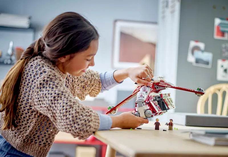 Fans can command their own missions from Star Wars: The Clone Wars with this buildable Coruscant Guard Gunship (75354), packed with authentic features for aerial combat and troop transport. Equipped with dual pilot cockpits, stud shooters, adjustable cannons, and a carry handle for high-flying action, this gunship also includes a rear hatch and sliding side panel to access a cabin that fits multiple troopers. A standout set for fans aged 9 and up, it includes five iconic characters—Commander Fox, Chancellor Palpatine, Padmé Amidala, and two Coruscant Guards—along with detailed blasters for action play.