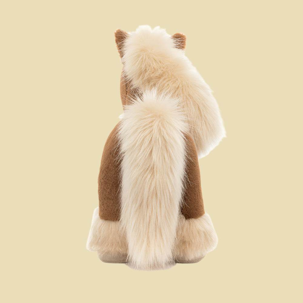 Freya Pony is a graceful beauty with a warm toffee coat and a flowing blonde mane and tail. Standing tall with soft beige hooves and delicate feathering, she’s ready to prance into your heart. With leaf-fold ears and soft suedette nostrils, this charming pony is a true dressage star!